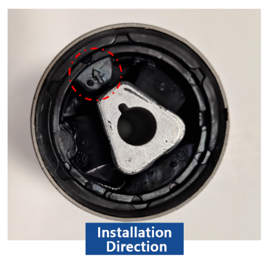 Le linn na suiteála, cinntigh go bhfuil an chuid soladach (neamh-scoilte) den bushing ailínithe le treo cothrománach taistil na feithicle. Má tá saighead treoshuímh sa bhus, caithfidh an tsaighead seo a bheith dírithe ar aghaidh sa treo taistil.
